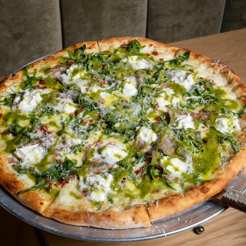 12-inch $28.00 | 16-inch $34.00 • Olive oil & garlic sauce, shredded mozzarella cheese, topped with arugula, burrata, prosciutto, sun-dried tomatoes and a pesto drizzle