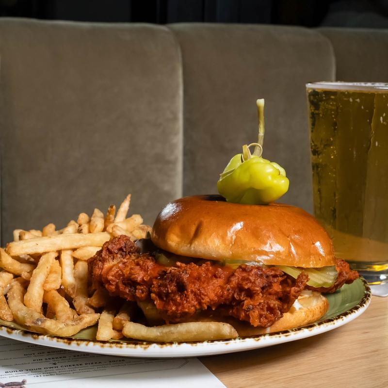 Fried chicken tossed in buffalo sauce, coleslaw, pickles, and white cheddar cheese. Served on a brioche bun