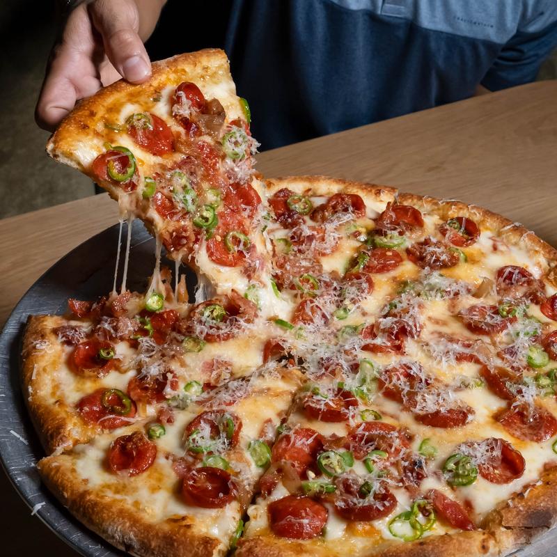 12-inch $25.00 | 16-inch $31.00 • Fresh tomato sauce, pepperoni, bacon, caramelized onions, serrano peppers, hot honey