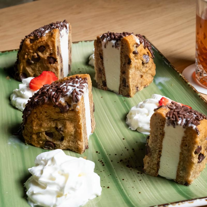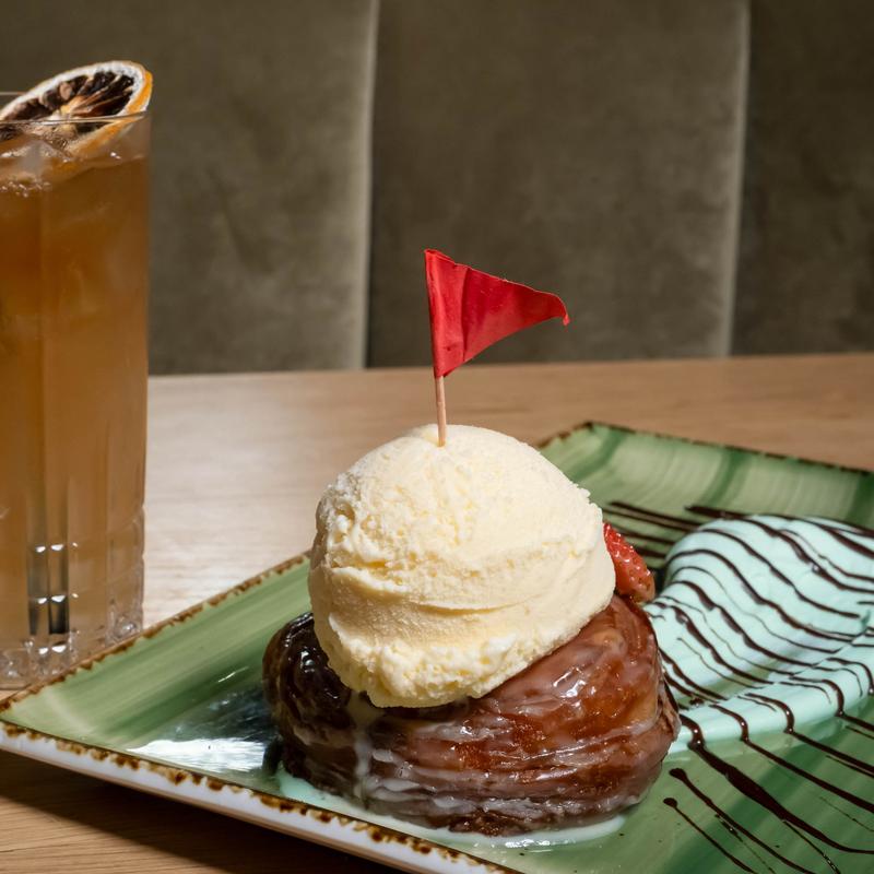 Glazed donut topped with vanilla ice cream. Served with mint whipped cream