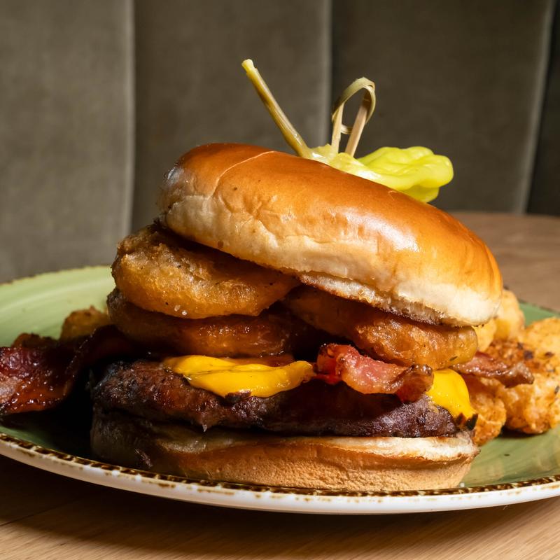 8 oz. American Wagyu beef patty, barbecue sauce, onion rings, candied bacon, and cheddar cheese. Served on a brioche bun