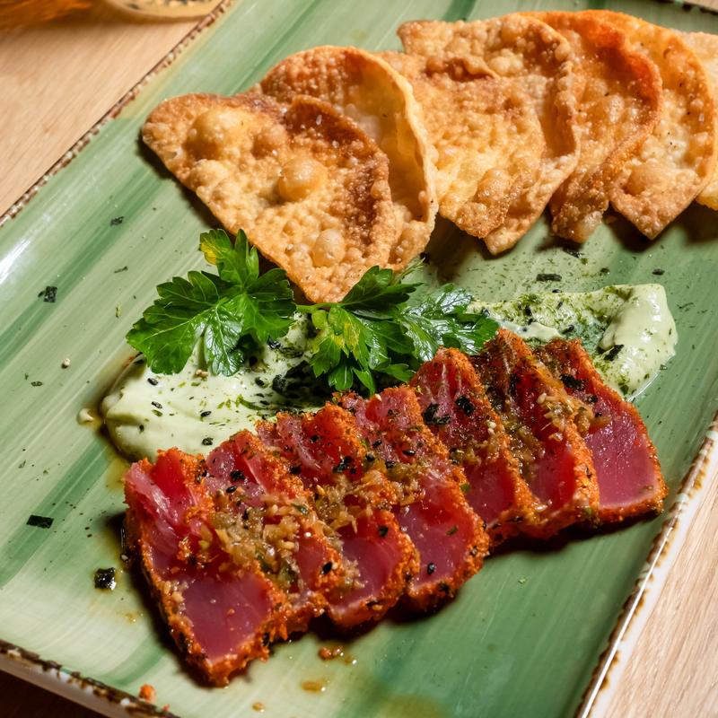 Sashimi grade Ahi tuna. furikake seasoning, tataki sauce, wasabi avocado puree, cilantro, and sesame. Served with wonton chips