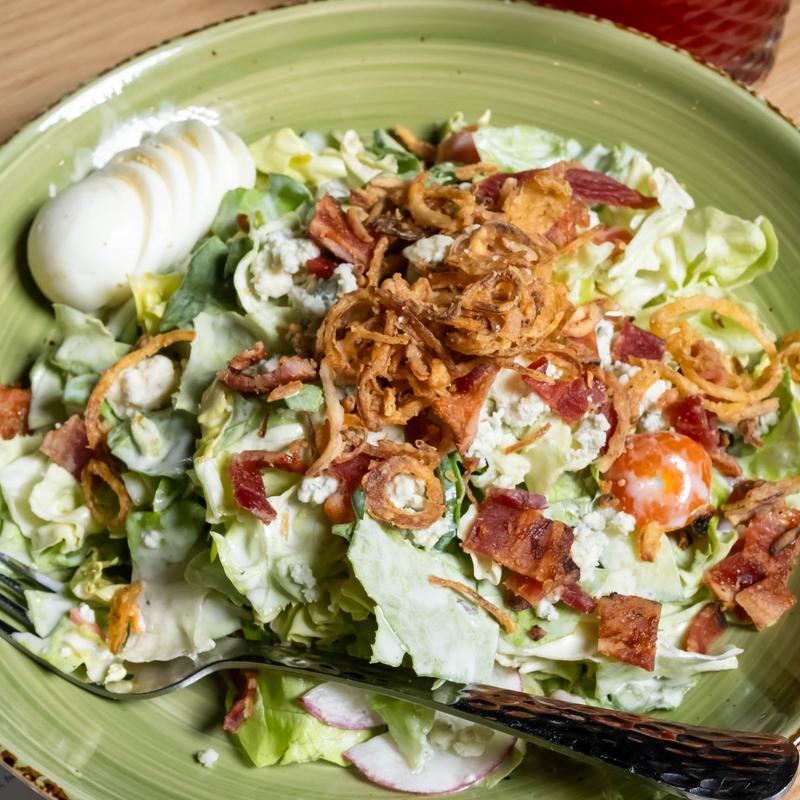 Butter lettuce, radish, cherry tomatoes, cucumber, crispy shallots, green olives, candied bacon, bleu cheese crumbles, and hard-boiled egg. Served with bleu cheese dressing